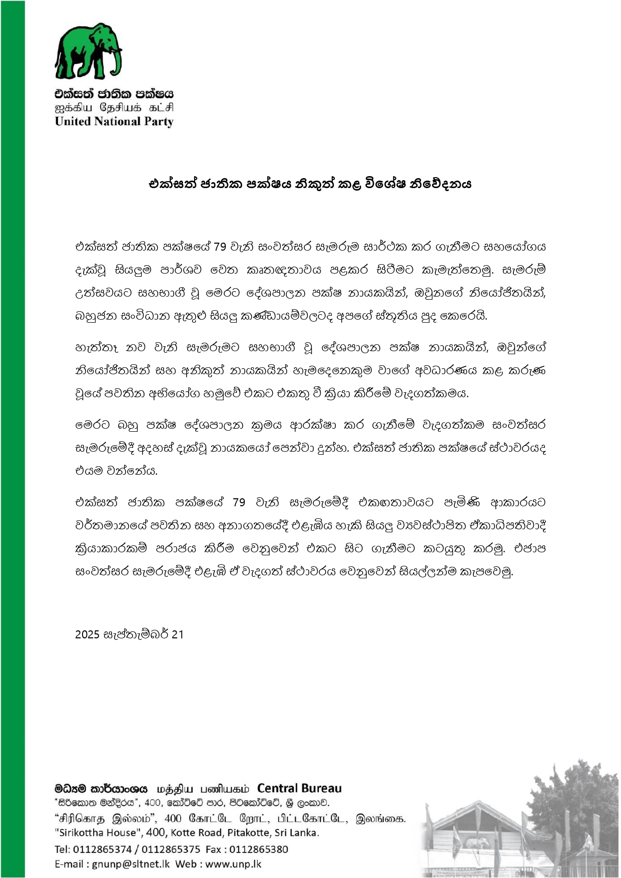 මෙම නිවේදනය නිකුත් කර තිබුණේ ඊයේ පැවති එ.ජා.ප. 79 වැනි සංවත්සරයට එක් වූ වන්ට ස්තුතිය පළ කිරීම සදහායි.