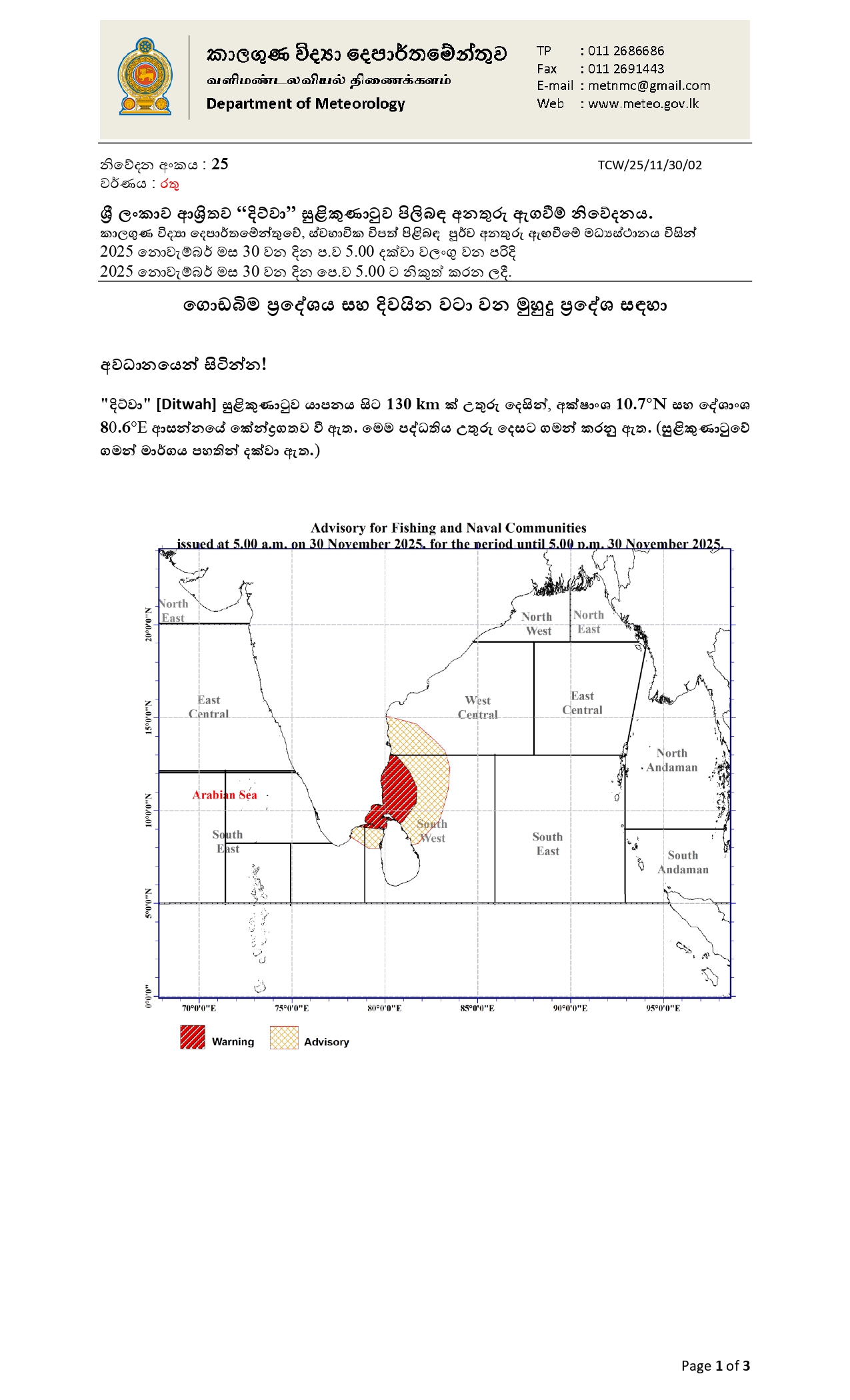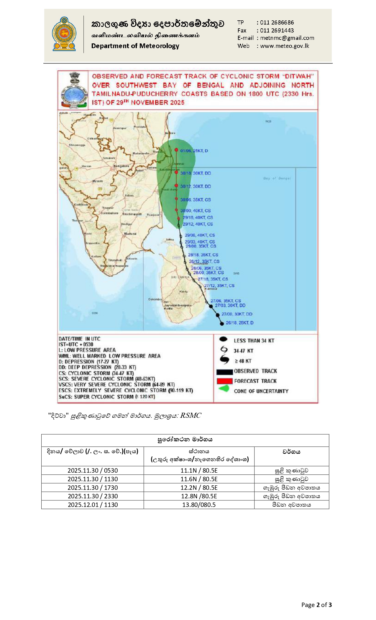 දිට්වා සුළි කුණටුව යාපනය සිට කි.මී. 130 ක් උතුරු දෙසින් කේන්ද්‍රගත වී ඇතැයි කාලගුණ විද්‍යා දෙපාර්තමේන්තුව පවසනවා.