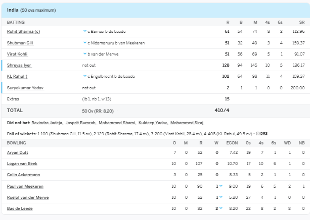 කාසියේ වාසිය දිනා දිනා පළමුවෙන් පන්දුවට පහර දුන් ඉන්දීය කණ්ඩායම නියමිත පන්දුවාර 50 අවසානයේ කඩුලු 04ක් දැවී ලකුණු 410ක් ලබා ගත්තා
