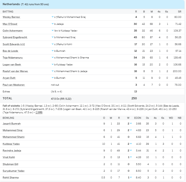 අනතුරුව ලකුණු 411ක ඉලක්කයක් හඹා යාමට පිටියට පිවිසි නෙදර්ලන්ත කණ්ඩායම පන්දුවාර 47යි පන්දු 05ක් අවසානයේ සියලුදෙනා දැවී ලබා ගත්තේ ලකුණු 250ක් පමණයි
