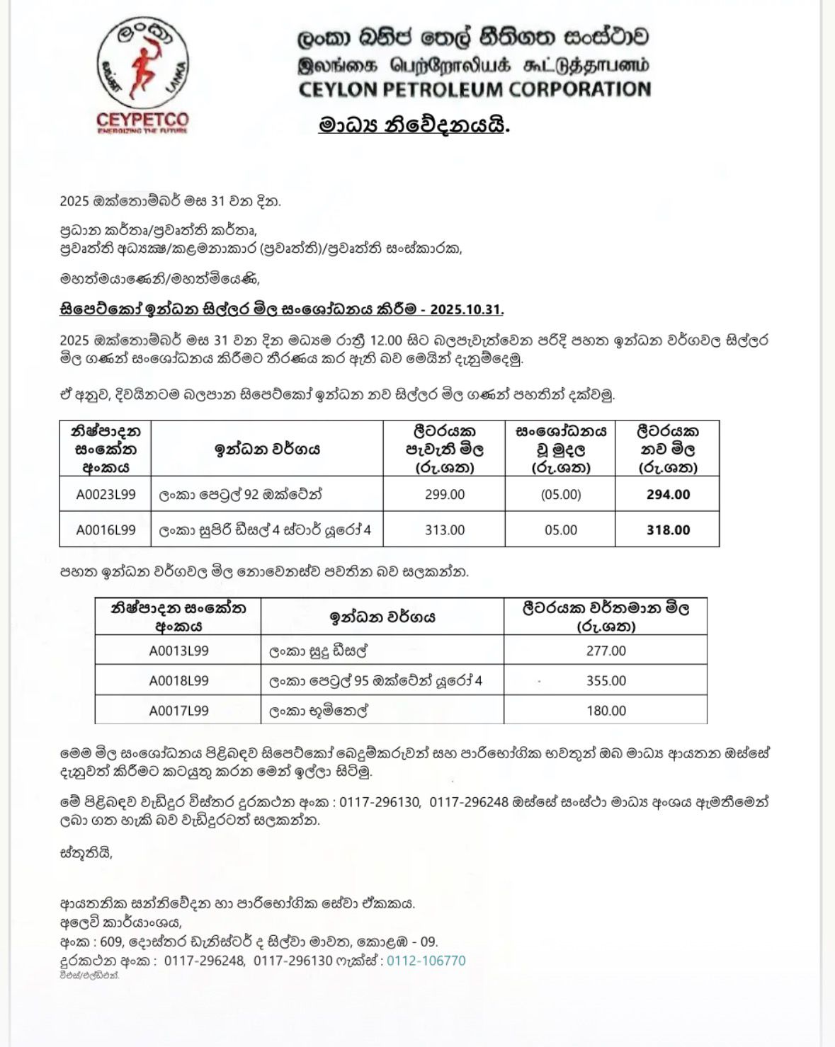 මාසික ඉන්ධන මිල සංශෝධනය අනුව නවතම ඉන්ධන මිල ගණන් සම්බන්ධව ලංකා ඛණිජ තෙල් නීතිගත සංස්ථාව නිවේදනයක් නිකුත් කර තිබෙනවා.