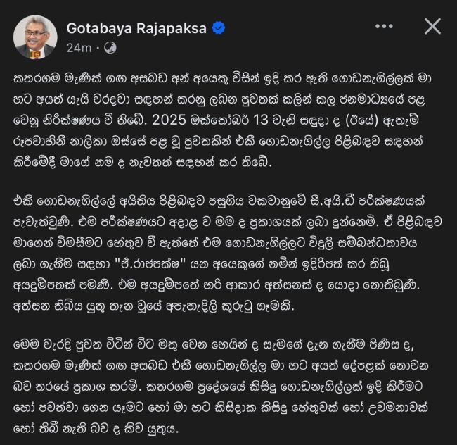 කතරගම මැණික් ගඟ අසබඩ ඉදිකර ඇති ගොඩනැගිල්ලක් තමාට අයත් බවට මාධ්ය විසින් පළ කර ඇති පුවතක් සම්බන්ධයෙන් හිටපු ජනාධිපති ගෝඨාභය රාජපක්ෂ මහතා සිය නිල ෆේස්බුක් පිටුවෙහි සටහනක් තබමින් ඉදිරිපත් කර තිබෙනවා.