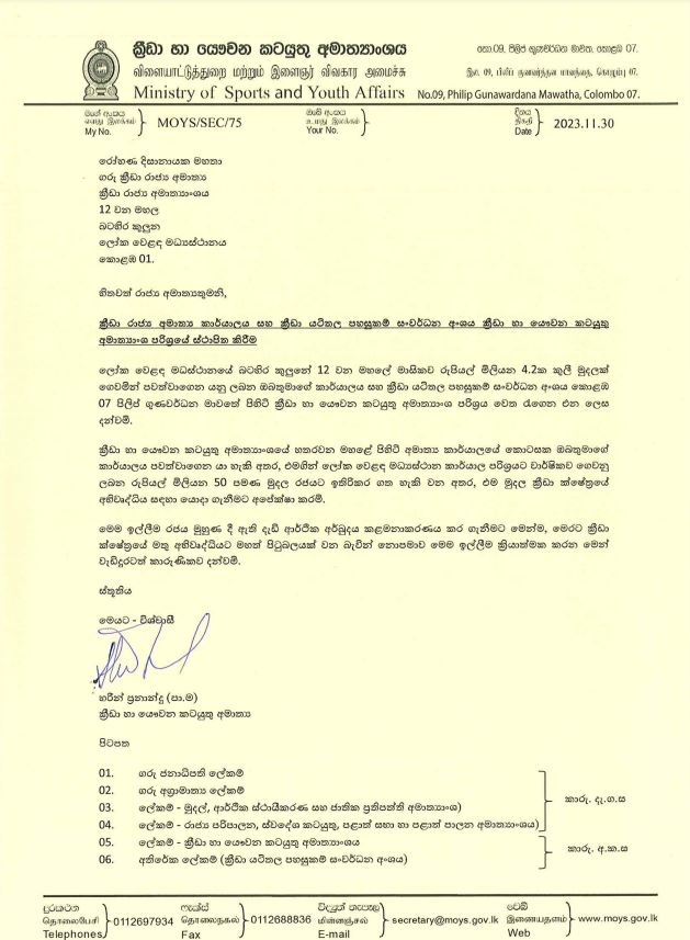 ක්‍රීඩා රාජ්‍ය අමාත්‍යවරයාගේ කාර්යාලය සහ ක්‍රීඩා යටිතල පහසුකම් සංවර්ධන අංශය ක්‍රීඩා හා යෞවන කටයුතු අමාත්‍යාංශ පරිශ්‍රය වෙන ගෙන එන ලෙස දන්වමින් ක්‍රීඩා හා යෞවන කටයුතු අමාත්‍ය හරින් ප්‍රනාන්දු මහතා විසින් රෝහණ දිසානායක මහතාට ලිපියක් යොමුකර තිබෙනවා.