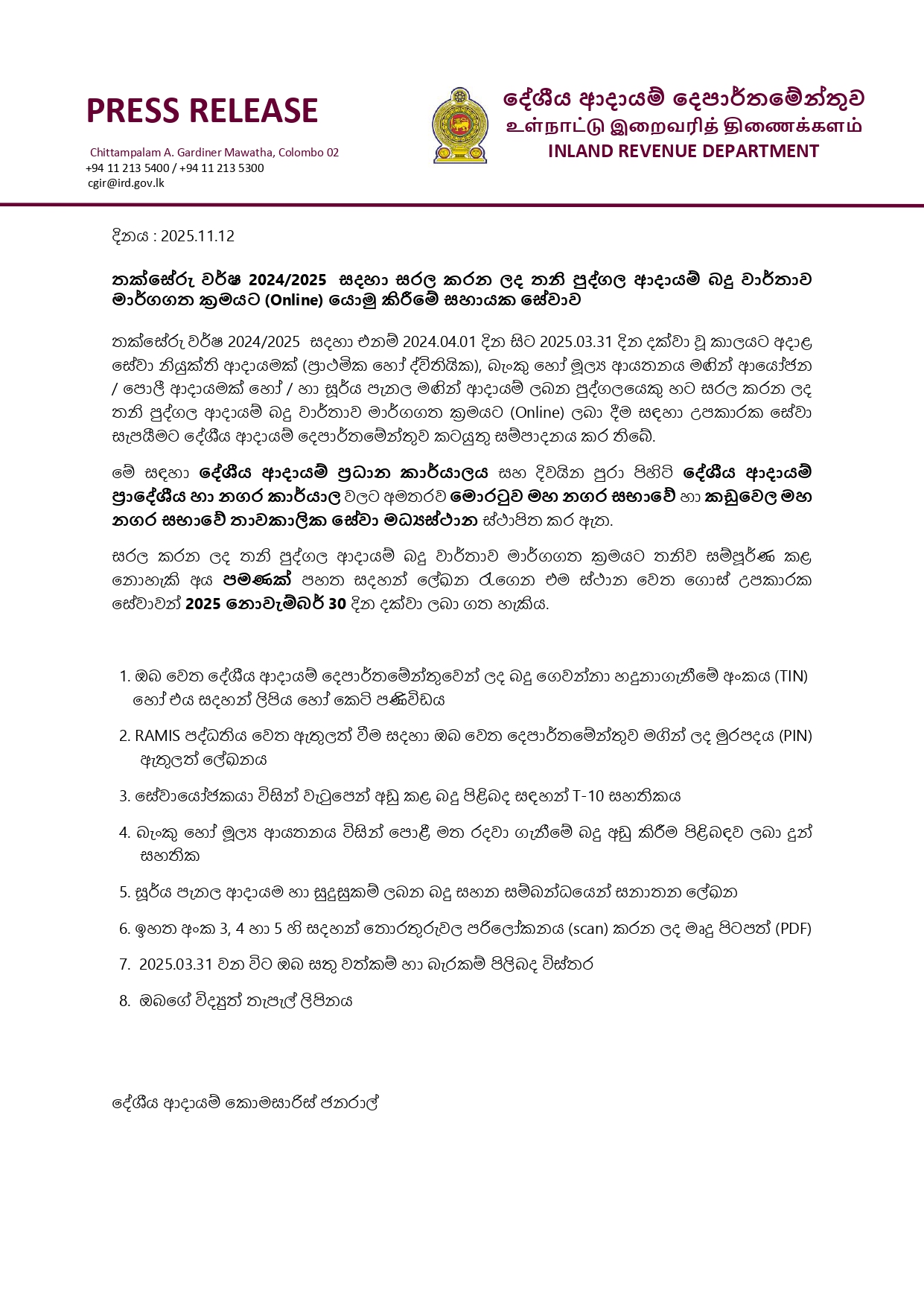 තක්සේරු වර්ෂ 2024/2025 සඳහා එනම් 2024 අප්රේල් මස 01 දින සිට 2025 මාර්ති 31 දක්වා වූ කාලයට අදාල සේවානියුක්ති ආදායමක් (ප්රාථමික හෝ ද්විතියික) බැංකු හෝ මූල්ය ආයතන මගින් ආයෝජන/පොලී ආදායමක් හෝ සූර්ය ප්-ඇනල මගින් ආදායම් ලබන පුද්ගලයකු හට සරල කරන ලද තනි පුද්ගල ආදායම් බදු වාර්තාව මාර්ග ගත ක්රමයට ලබාදීම සඳහා ( Online) උපකාරක සේවා සැපයීමට දේශීය ආදායම් දෙපාර්තමේන්තුව කටයුතු සම්පාදනය කර තිබෙන බව දැනුම් දෙනවා.
