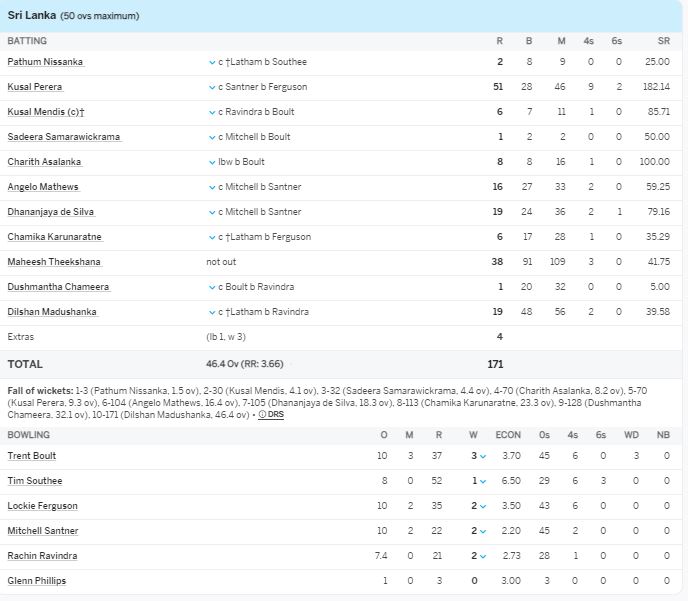 තරගයේ කාසියේ වාසිය දිනූ නවසීලන්ත කණ්ඩායමේ ආරාධනයෙන් ප්රථමයෙන් පන්දුවට පහරදුන් ශ්රී ලංකා කණ්ඩායම පන්දුවාර 46යි පන්දු 4ක් අවසානයේ
