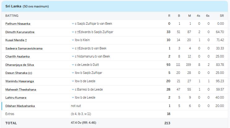 ඒ අනුව තරගය ජයග්රහණය කිරීම සඳහා නෙදර්ලන්ත කණ්ඩායමට හිමි වූ ඉලක්කය ලකුණු 214ක්