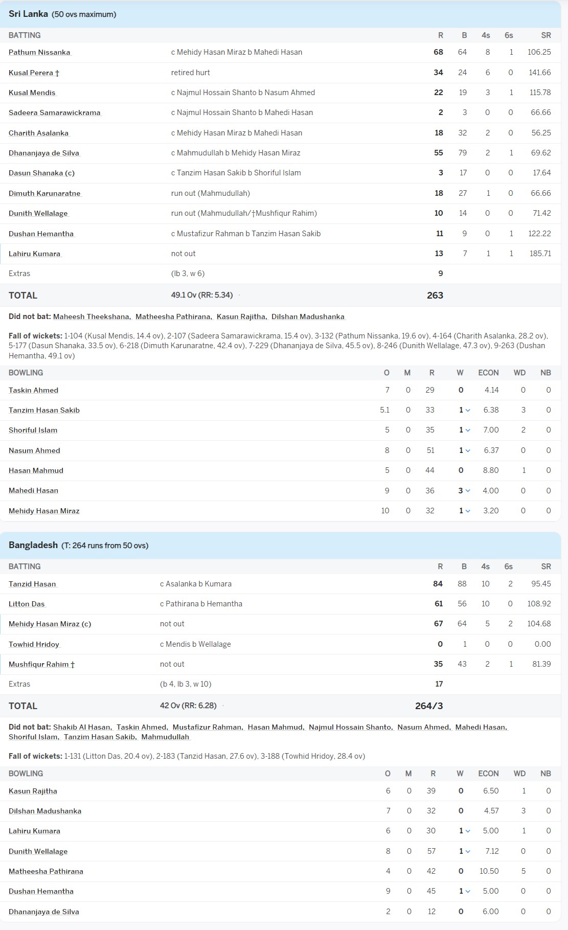 මේ අනුව ලකුණු 264 ක ඉලක්කයක් හඹා ගිය බංග්ලාදේශ කණ්ඩායම පන්දුවාර 42 ක් අවසානයේ ජය හිමි කර ගත්තා