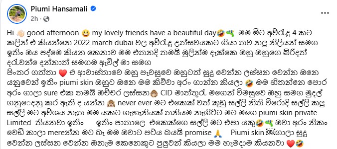ඒ අතරතුර, “පොලිසිය තමාගෙන් විමසීමක් කළ බව” කියන කතාව සත්යක් බව පියුමි විසින්ම තහවුරු කරනවා.