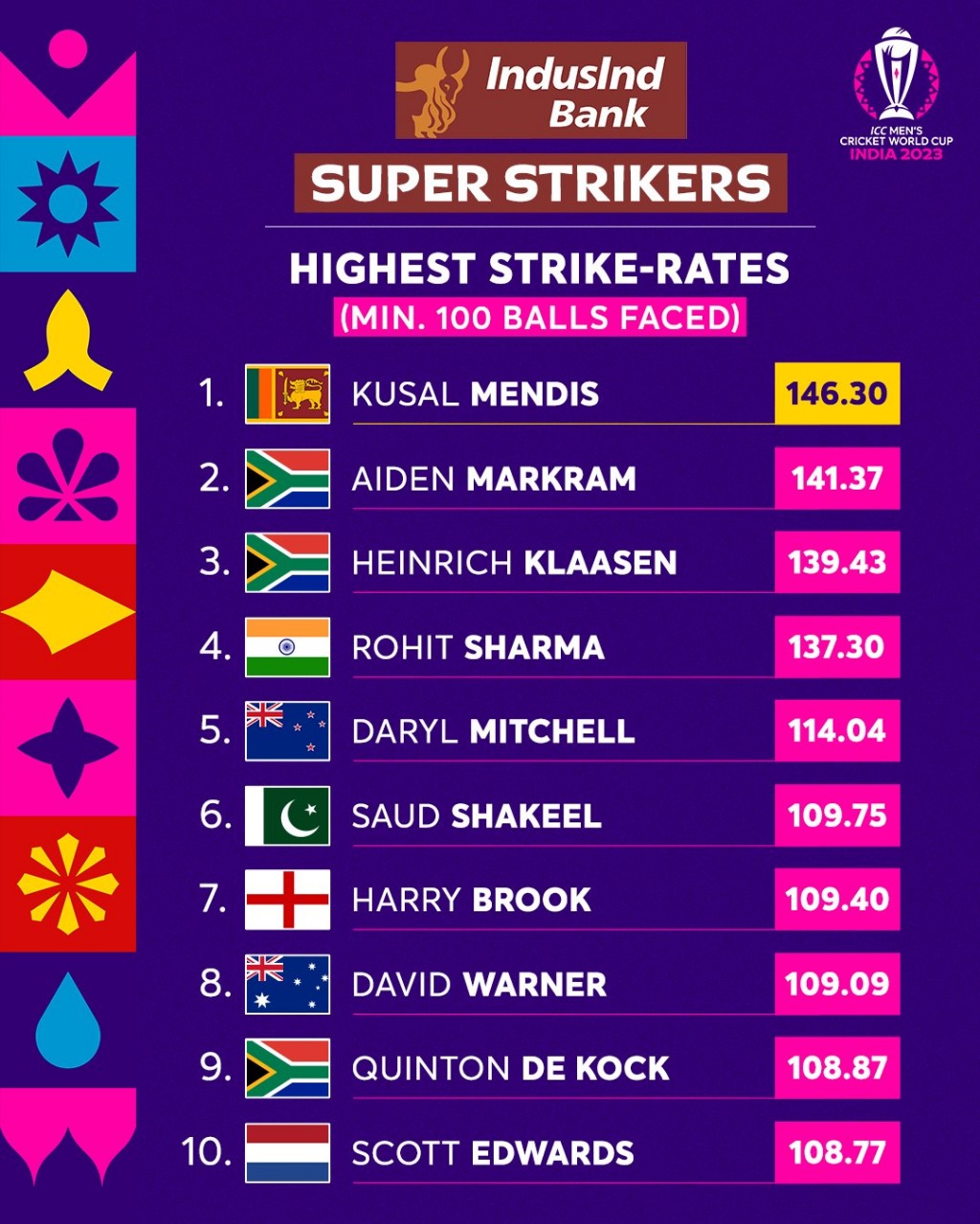 මෙවර ලෝක කුසලානයේ මෙතෙක් පැවති තරගවලට අනුව ඉහළම ප්රහාරාත්මක වේගයක් සහිත පිතිකරුවන්ගේ ලැයිස්තුවේ පෙරමුණ තවදුරටත් හිමිකර ගැනීමට කුසල් මෙන්ඩිස් සමත්ව තිබෙනවා