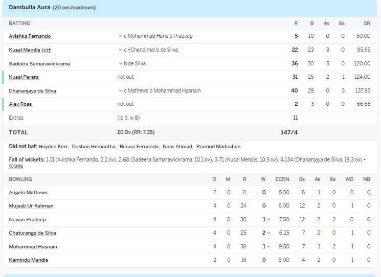 තරගයේ කාසියේ වාසිය දිනා පළමුව පන්දුවට පහර දුන් Dambulla Aura කණ්ඩායම පන්දුවාර 20 අවසානයේ කඩුලු 4ක් දැවී ලකුණු 147ක් ලබා ගත්තා.