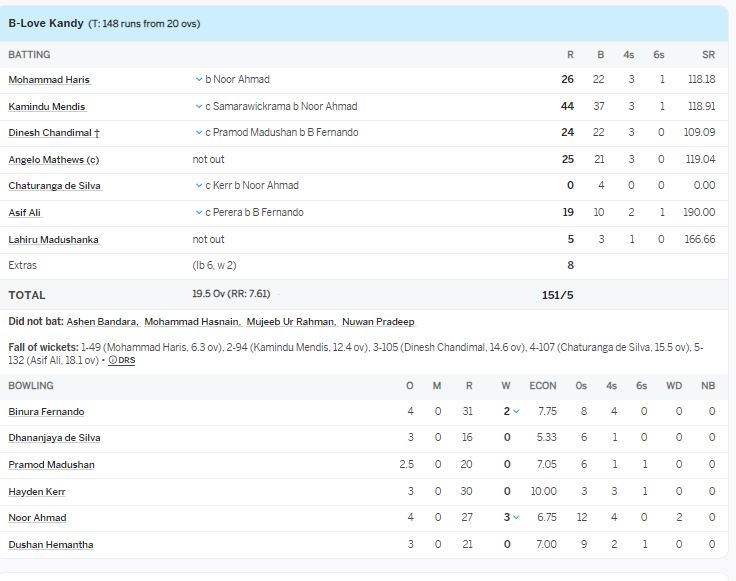 අනතුරුව ලකුණු 148 ක ජයග්රාහී ඉලක්කයක් හඹා ගිය B-Love Kandy කණ්ඩායම ලකුණු 151 ක් ලබා ගනිමින් සිය ජයග්රහණය තහවුරු කළා.