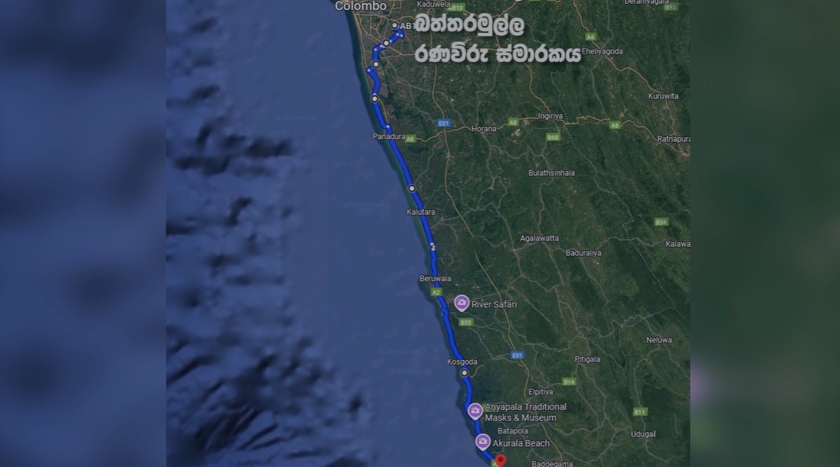 සීනිගම පුද බිමේ සිට ගාල්ල – කොළඹ ප්‍රධාන මාර්ගය ඔස්සේ රත්මලාන,අත්තිඩිය,නුගේගොඩ,විජේරාම පාර මාදිවෙල හරහා බත්තරමුල්ල රණවිරු ස්මාරකය දක්වා පැමිණීමට නියමිතයි.
