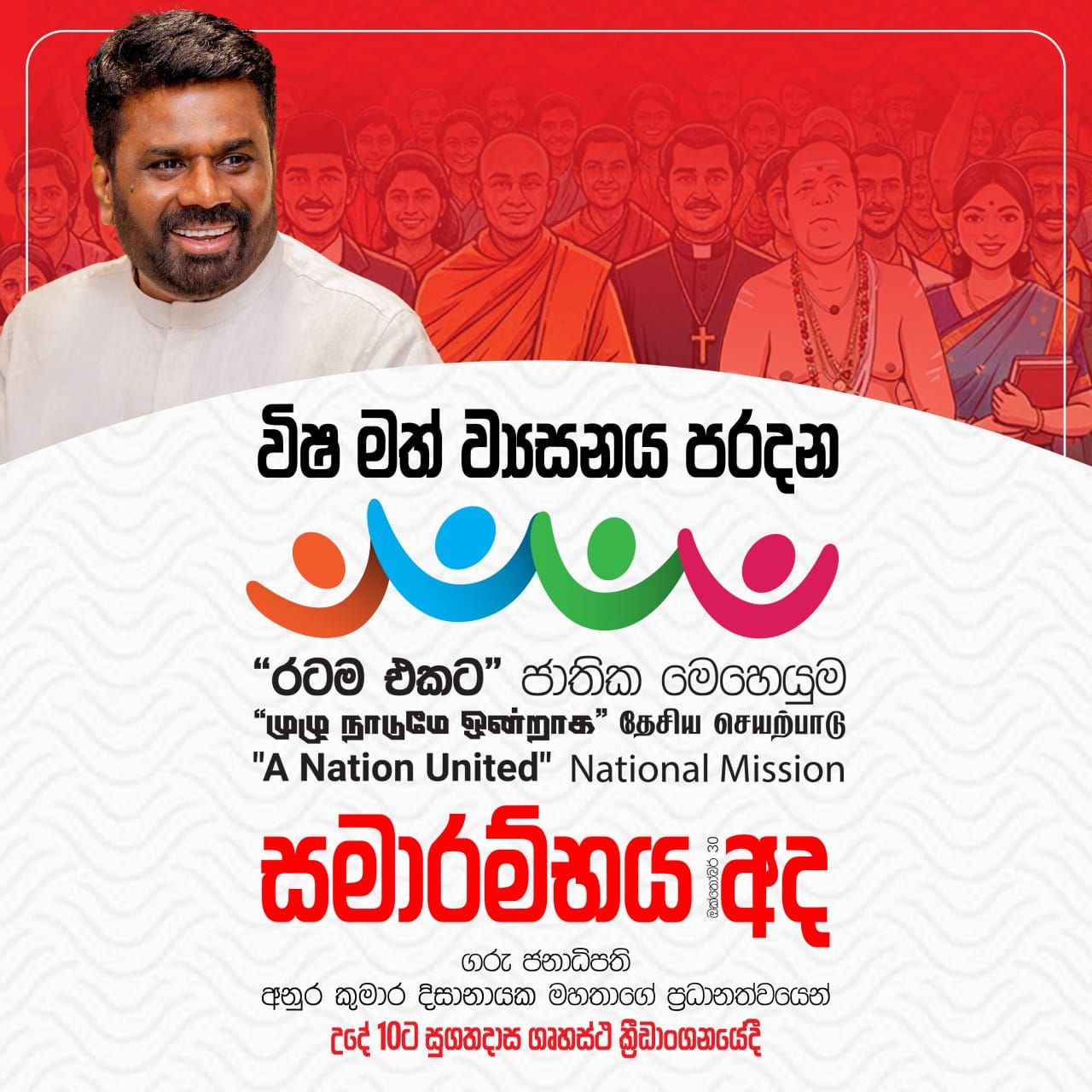 “රටම එකට‍ ජාතික මෙහෙයුම” අද ජනාධිපති අනුර කුමාර දිසානායක මහතාගේ ප්‍රධානත්වයෙන් කොළඹ සුගතදාස ගෘහස්ථ ක්‍රීඩාංගනයේදී ආරම්භ කෙරෙනවා.