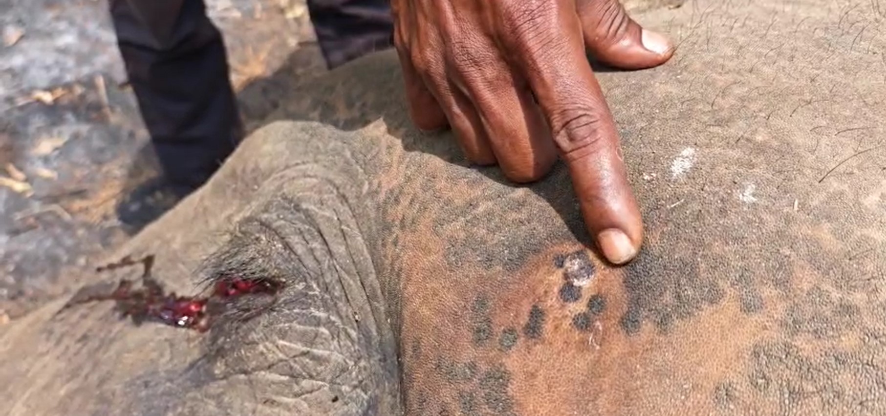 අප වාර්තාකරු පවසන්නේ මියගිය වන අලියාගේ ඇස්වලින් ලේ වහනය වී තිබූ බවයි.