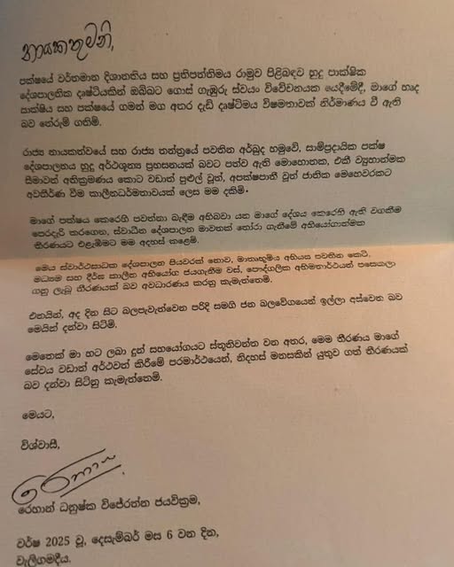” පක්ෂයේ වර්තමාන දිශානතිය සහ ප්රතිපත්තිමය රාමුව පිළිබදව හුදු පාක්ෂික දේශපාලණික දෘෂ්ටියකින් ඔබ්බට ගොස් ගැඹුරු ස්වයං විවේචනයක යෙදීමේදී, මාගේ හෘද සාක්ෂිය සහ පක්ෂයේ ගමන් මග අතර දැඩි දෘෂ්ඨිමය විෂමතාවක් නිර්මාණය වී ඇති බව තේරුම් ගතිමි.