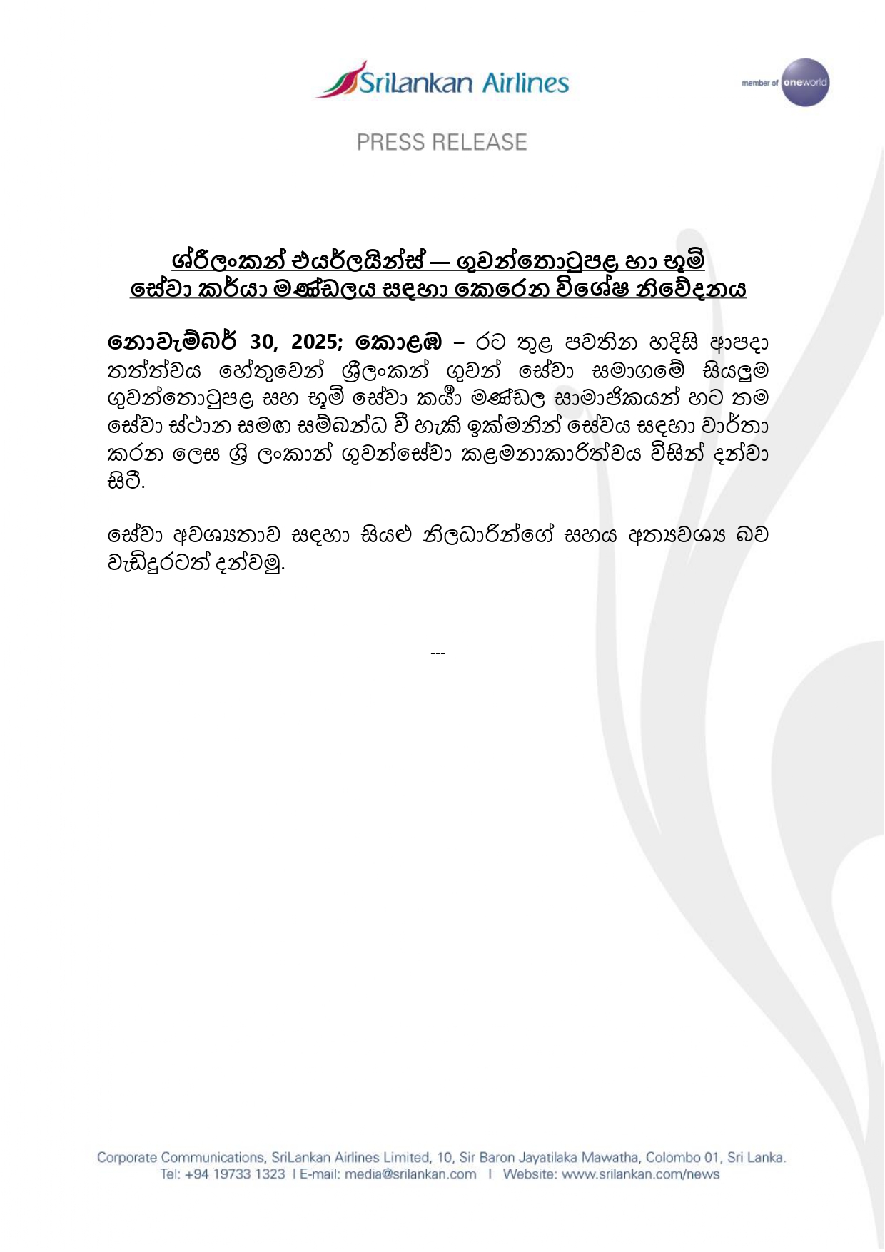 ශ්රීලංකන් එයර්ලයින්ස් — ගුවන්තොටුපළ හා භූමි සේවා කාර්ය මණ්ඩලය සඳහා විශේෂ නිවේදනයක්
