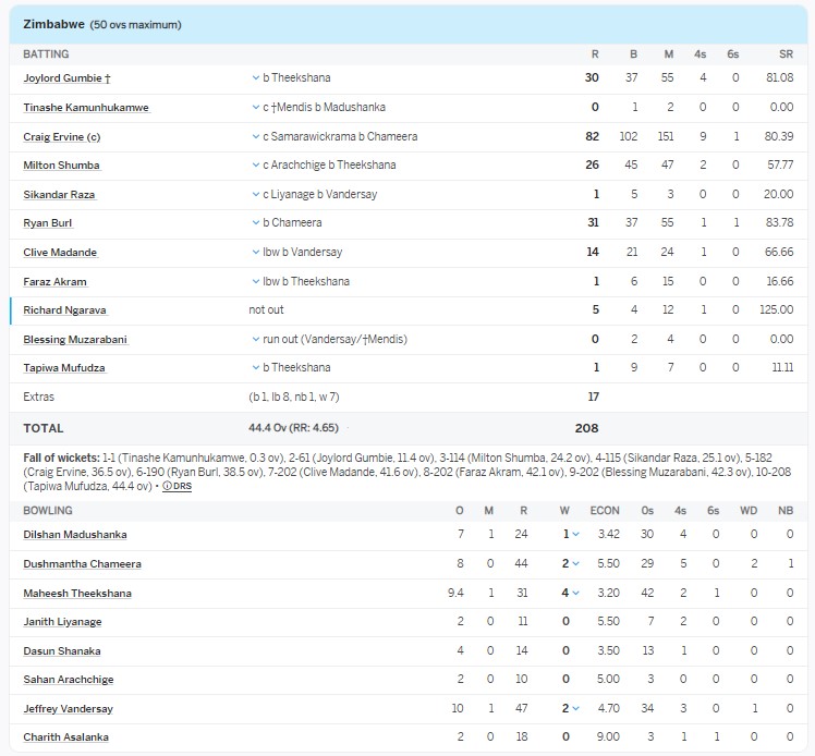 තරගයේ කාසියේ වාසිය දිනා පළමුව පන්දුවට පහර දුන් සිම්බාබ්වේ කණ්ඩායමට සියලු ක්රීඩකයන් දැවී ලබා ගත හැකි වූයේ ලකුණු 208ක් පමණයි.