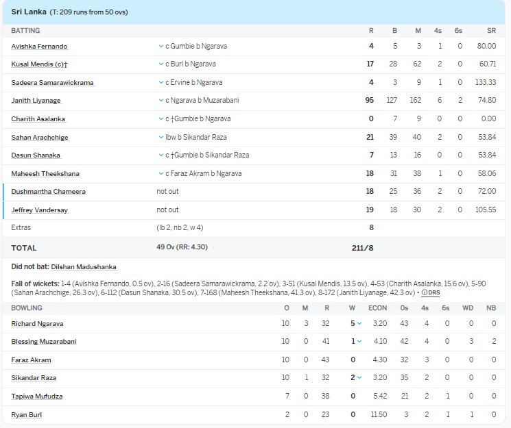 පිළිතුරු ඉනිම ක්රීඩා කිරීම සඳහා පිටියට පැමිණි ශ්රී ලංකා කණ්ඩායම පන්දුවාර 49ක් අවසානයේ කඩුලු 08ක් දැවී ලකුණු 211ක් ලබා ගනිමින් සිය ජය වාර්තා කළා.