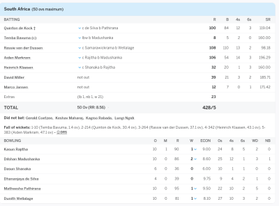 ලෝක කුසලාන තරගාවලියේ 04වන තරගයේ පළමුව පන්දුවට පහර දුන් දකුණු අප්රිකා කණ්ඩායම ලකුණු 428ක් වාර්තා කළා.