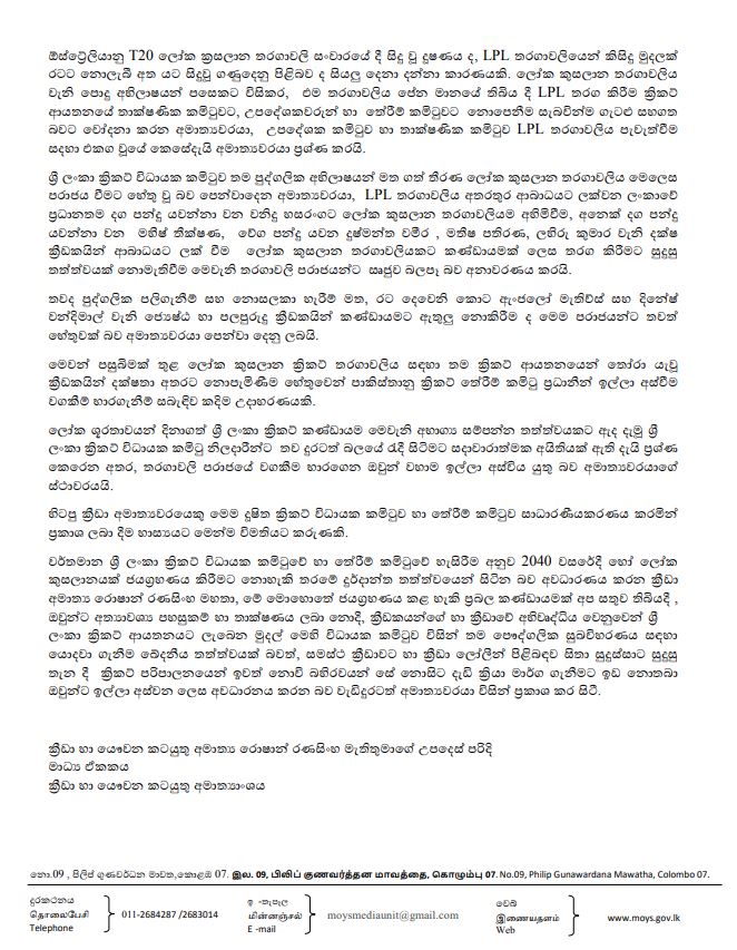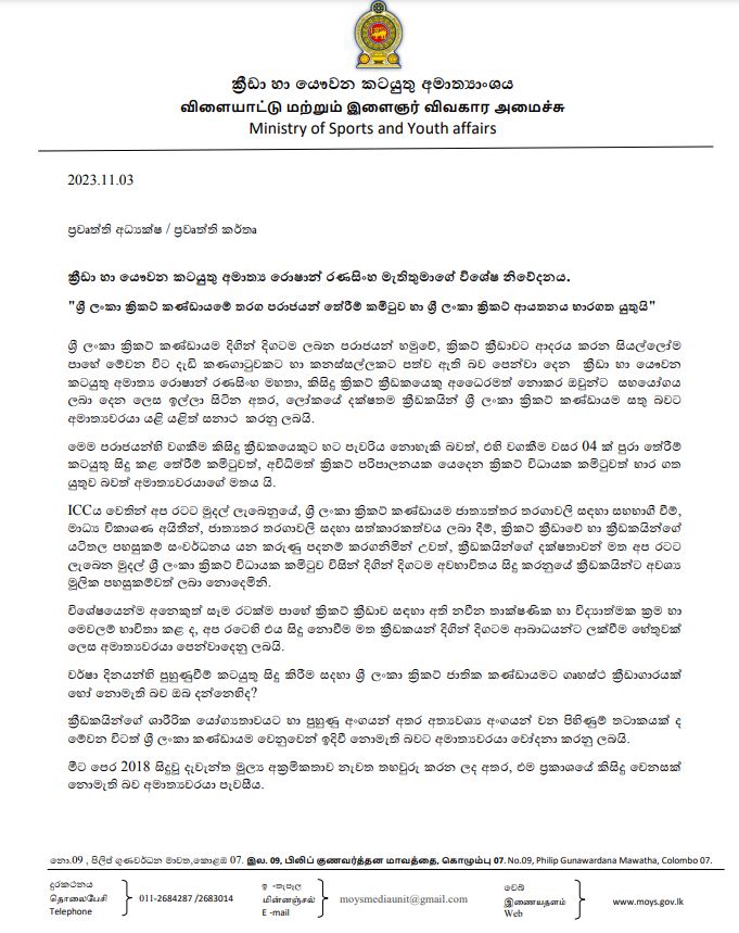 ශ්‍රී ලංකා ක්‍රිකට් කණ්ඩායමේ තරග පරාජයන් ගැන ඇමතිගෙන් විශේෂ නිවේදනයක්