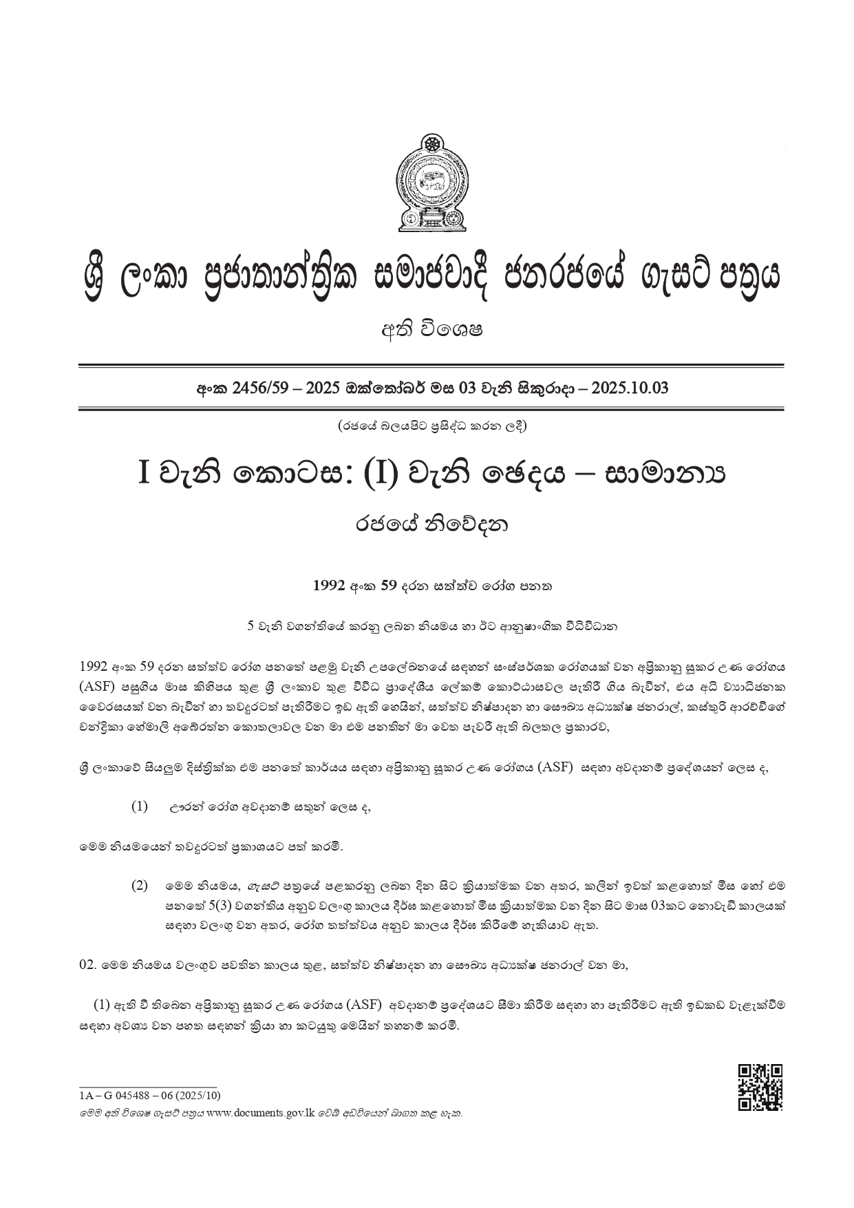 1992න් අංක 52 දරණ සත්ව රෝග පනතට අනුව සංස්පර්ශක රෝගයක් වන අප්රිකානු සූකර උණ රෝගය පසුගිය මාස කිහිපය තුල ශ්රී ලංකාව තුල විවිධ ප්රාදේශීය ලේකම් කොට්ඨාශ තුළ පැතිරී ගිය බැවින් එය අධි ව්යාධිජනක වෛරසයක් වන බැවින් හා තවදුරටත් පැතිරීමට ඉඩ ඇති බැවින් සත්ව නිෂ්පාදන හා සෞඛ්ය අධ්යක්ෂ ජනරාල් අති විශේෂ ගැසට් නිවේදනයකින් දැනුම් දෙනවා.