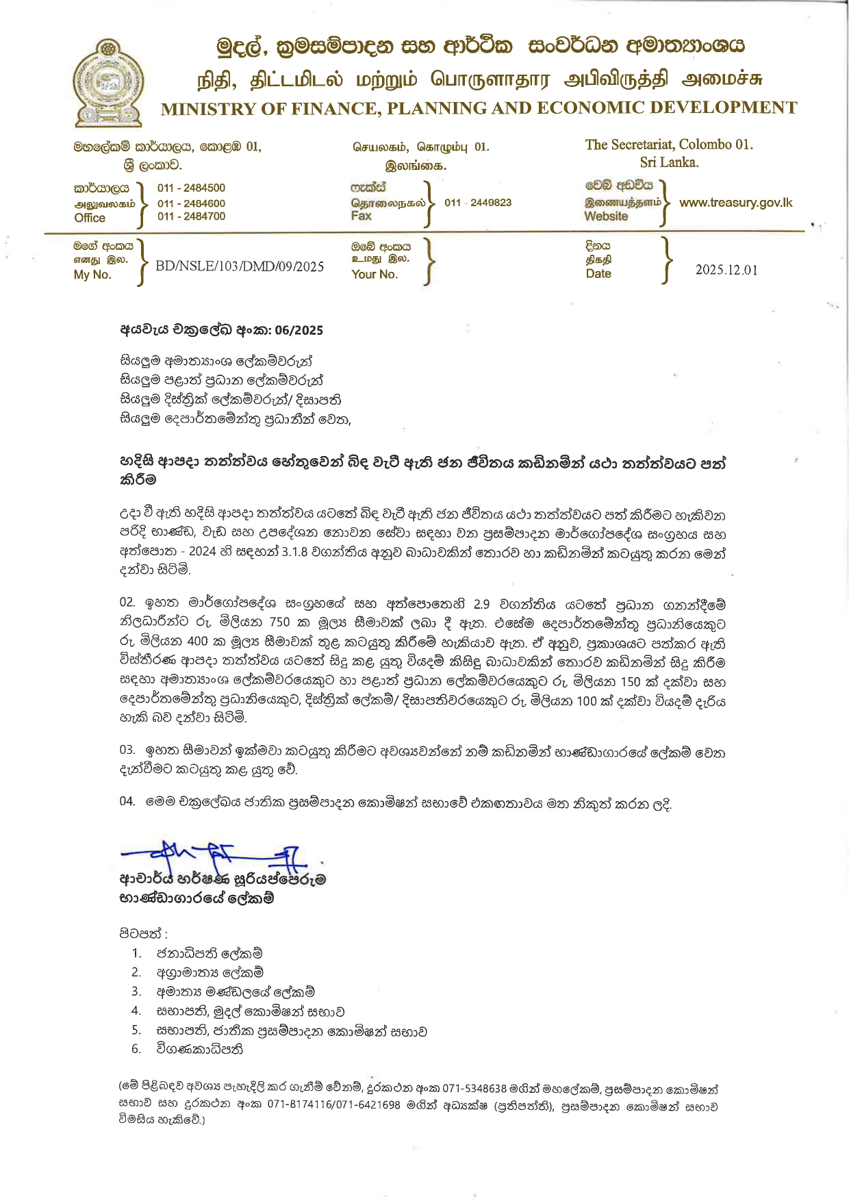 හදිසි ආපදා තත්ත්වය යටතේ බිඳ වැටී ඇති ජන ජීවිතය යථාතත්ත්වට පත් කිරීමට හැකිවන පරිදි භාණ්ඩ වැඩ හා උපදේශන නොවන සේවා සඳහා වන ප්‍රසම්පාදන මාර්ගෝපදේශ සංග්‍රහය සහ අත්පොත 2024 හි සඳහන් 3.1.8. වගන්තිය අනුව බාධාවකින් තොරව හා කඩිනමින් කටයුතු කරන ලෙස භාණ්ඩාගාර ලේකම් ආචාර්ය හර්ෂණ සූරියප්පෙරුම මහතා සියලු අමාත්‍යාංශ ලේකම්වරුන්,පළාත් ලේකම්වරුන්,දිස්ත්‍රික් ලේකම්වරුන් සහ දෙපාර්තමේන්තු ප්‍රධානීන් වෙත දැනුම් දී තිබෙනවා.