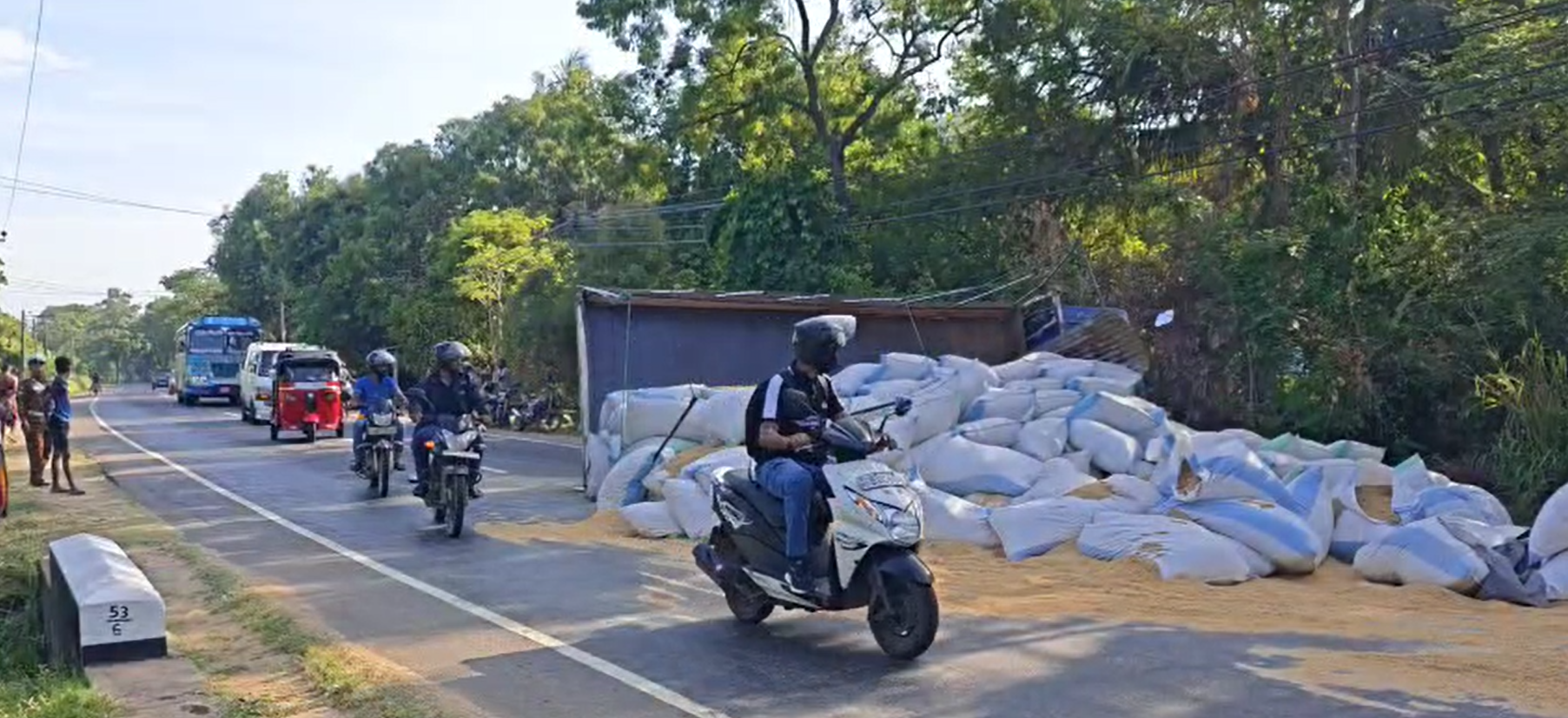 ලොරි රථයේ ගමන් ගත්ත රියදුරා සුළු තුවාල ලබා ඇති අතරින් ලොරි රථය පෙරළි යාමෙන් මාර්ගයේ දකුණු පසට වන්නට ඇති බෝක්කුවක පැති බැම්මද කඩා ගෙන මාර්ගයේ මැද ලොරි රථය පෙරළී ගොස් තිබෙනවා.