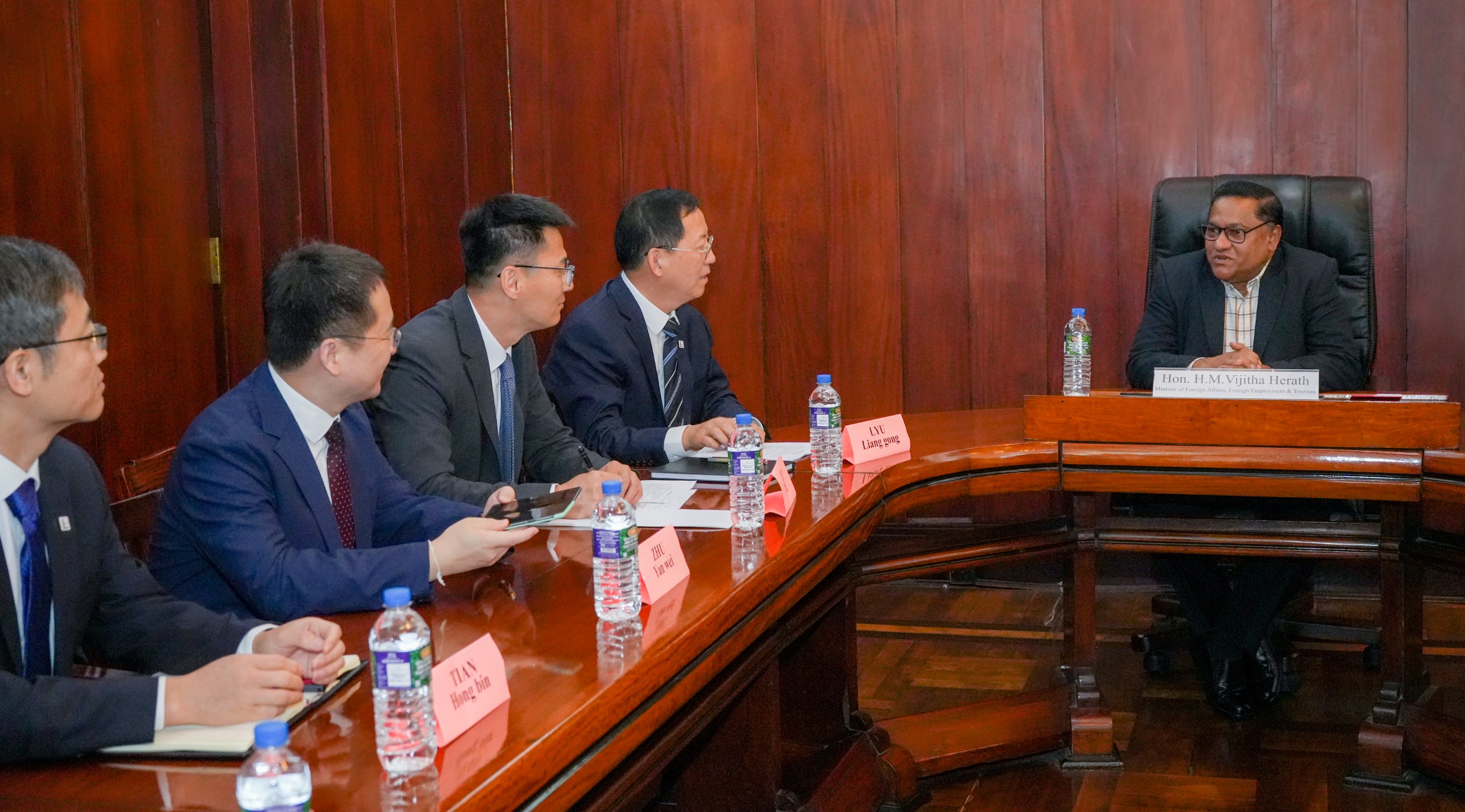 ඇ.ඩො. බිලියන 3.7ක ආයෝජනයකින් හම්බන්තොට ප්‍රදේශයේ ආරම්භ කිරීමට නියමිත නව තෙල් පිරිපහදු ව්‍යාපෘතියේ ප්‍රගතිය සහ ව්‍යාපෘතිය පිළිබඳ නොවිසඳුනු ගැටලු සාකච්ඡා කිරීමට චීනයේ සයිනොපෙක් සමාගමේ උප සභාපති ලුයූ ලියැන්ගොං මහතා ඇතුළු දස දෙනෙකුගෙන් යුතු නියෝජිත කණ්ඩායමක් අද (15) විදේශ කටයුතු, විදේශ රැකියා සහ සංචාරක අමාත්‍ය විජිත හේරත් මහතා එම අමාත්‍යංශයේ දී මුණගැසුණා.