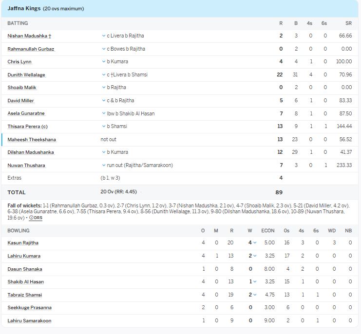 ඒ අනුව නියමිත පන්දුවාර 20 අවසානයේ සියලු දෙනා දැවී ඔවුන් ලකුණු 89ක් රැස් කළා.
