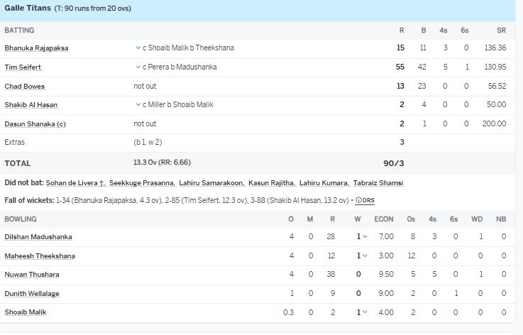 පිළිතුරු ඉනිම සඳහා ලකුණු 90ක ඉලක්කයක් හඹා ගිය Galle Titans පන්දුවාර 13 යි පන්දු 03 කදී ලකුණු 90 ක් ලබා ගනිමින් ජයග්රාහී සීමාව පසු කර ගියා.
