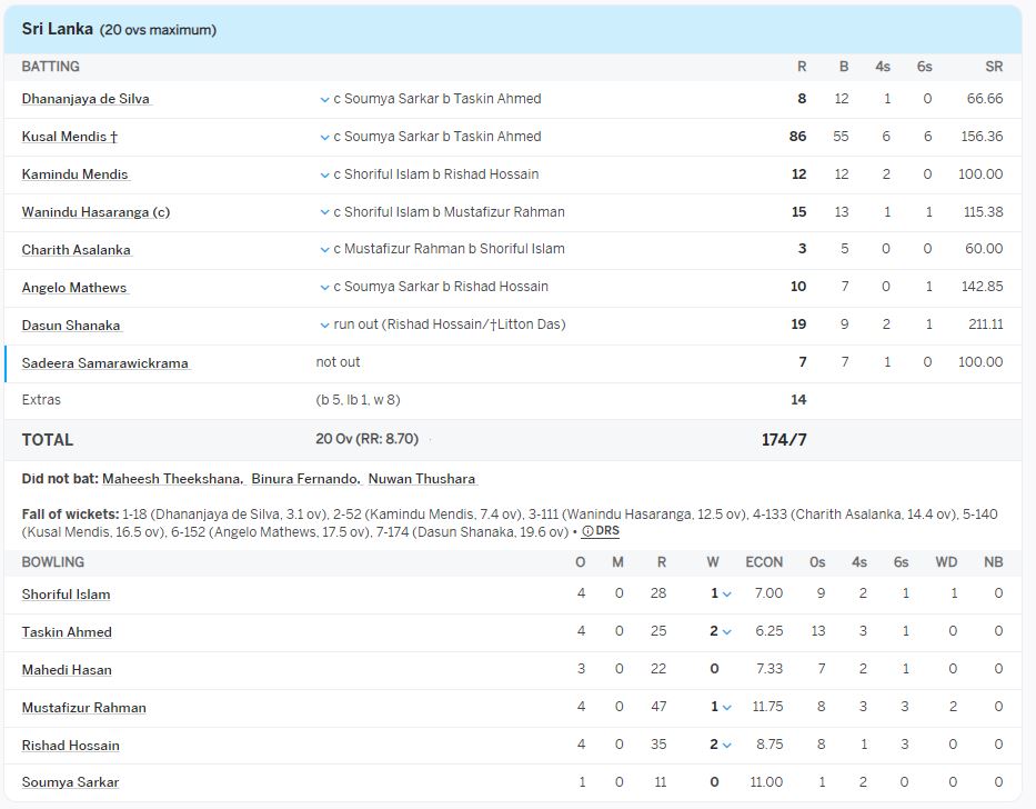 තරගයේ පළමුවෙන් පන්දුවට පහර දුන් ශ්රී ලංකා කණ්ඩායම නියමිත පන්දුවාර 20 අවසානයේ කඩුලු 7ක් දැවී ලකුණු 174ක් ලබා ගත්තා
