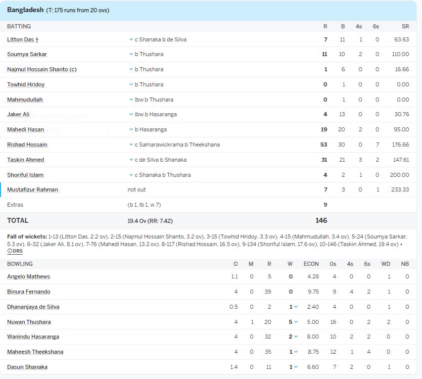 අනතුරුව ලකුණු 175ක ඉලක්කයක් හඹා යාමට පිටියට පිවිසි බංග්ලාදේශ කණ්ඩායම්ට පන්දුවාර 19යි පන්දු 04කදී සියලු දෙනා දැවී ලබා ගත හැකි වූයේ ලකුණු 146ක් පමණයි