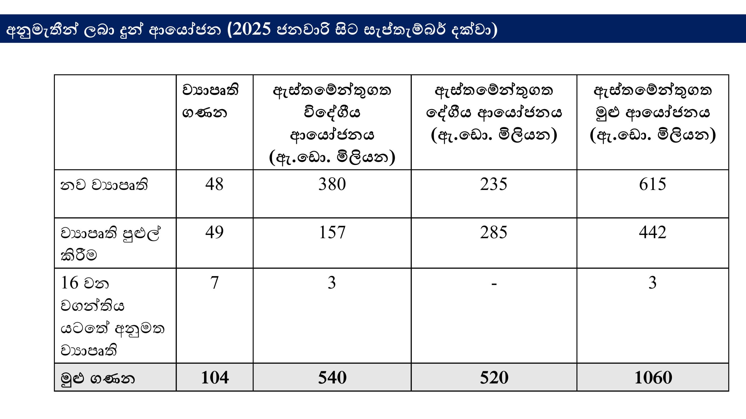 2025 ජනවාරි සහ සැප්තැම්බර් අතර, ශ්රි ලංකා ආයෝජන මණ්ඩල නීතියේ 17 වන වගන්තිය යටතේ නව ව්යාපෘති 48ක්, දැනට පවතින ව්යාපෘති පුළුල් කිරීම් 49 ක් සහ ශ්රි ලංකා ආයෝජන මණ්ඩල නීතියේ 16 වන වගන්තිය යටතේ අනුමැති ලත් ව්යාපෘති 7 කින් සමන්විත සමස්ත ඇස්තමේන්තුගත ආයෝජන වටිනාකම ඇ.ඩො. මිලියන 1,060 ක් සහිත ව්යාපෘති 104 ක් සඳහා ශ්රි ලංකා ආයෝජන මණ්ඩලයේ අනුමැති ලබා දී තිබෙනවා.