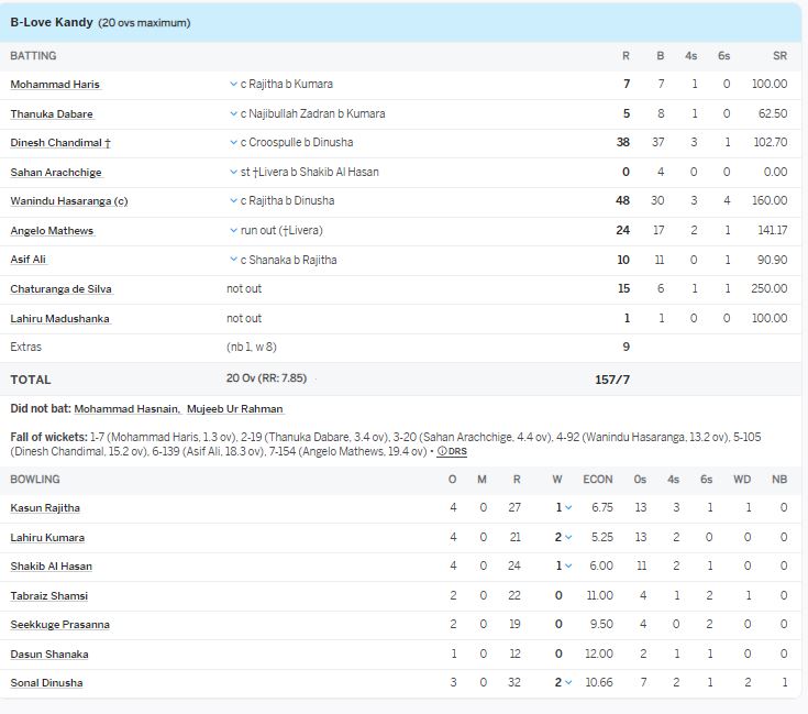 තරගයේ කාසියේ වාසිය දිනා පළමුව පන්දුවට පහර දුන් B-Love Kandy කණ්ඩායම නියමිත පන්දුවාර 20 අවසානයේ කඩුලු 07 දැවී ලකුණු 157 ක් ලබා ගත්තා.