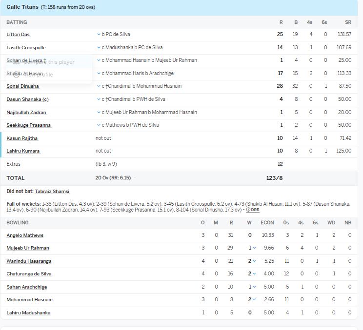 අනතුරුව ලකුණු 158 ක ජයග්රාහී ඉලක්කයක් හඹා ගිය Galle Titans කණ්ඩායම නියමිත පන්දුවාර 20 අවසානයේ කඩුලු 08 ක් දැවී ලබා ගත්තේ ලකුණු 123ක් පමණයි